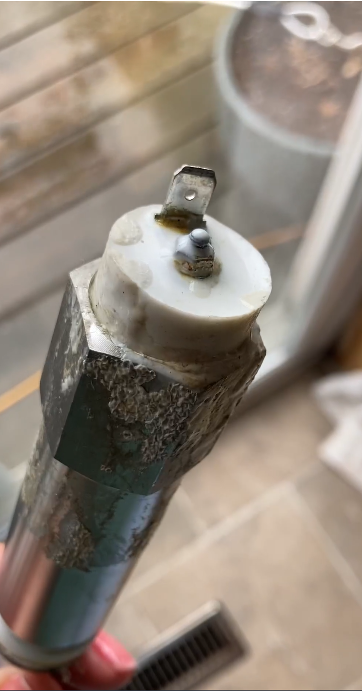 Sulfate-Reducing Bacteria (SRB) (H₂S) in untreated water creates a Biofilm of free-floating microorganisms. These organisms attach to a surface of the Anode. As they grow, they produce a slimy matrix (seen below anode) that helps them stick together creating a structured community. Hot water aerates the water which is detected by our nostrils.