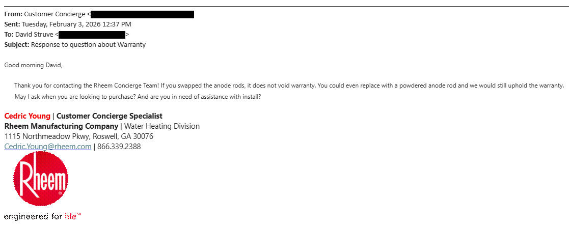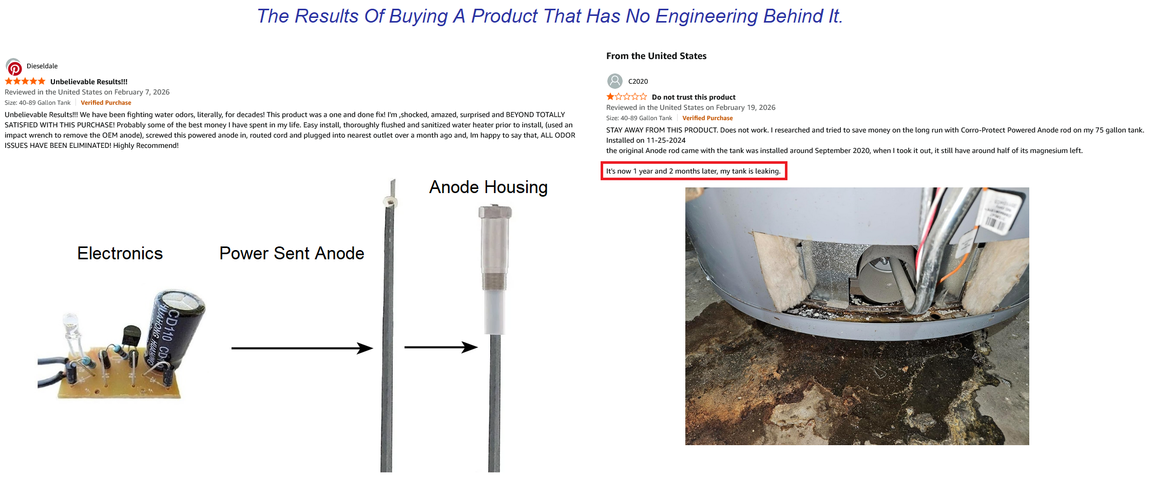 Even with thousands of reviews claiming it “eliminated my hot water odor within hours”, a Generic Powered Anode fails to offer long-lasting corrosion protection of the water tank, and that is unfortunately the reality. The initial satisfaction no more “hot water odor” with these products' persuasive advertising quickly fades when consumers find themselves looking for a contractor to replace the tank and the flooring that was damaged at 2 PM on a Friday.