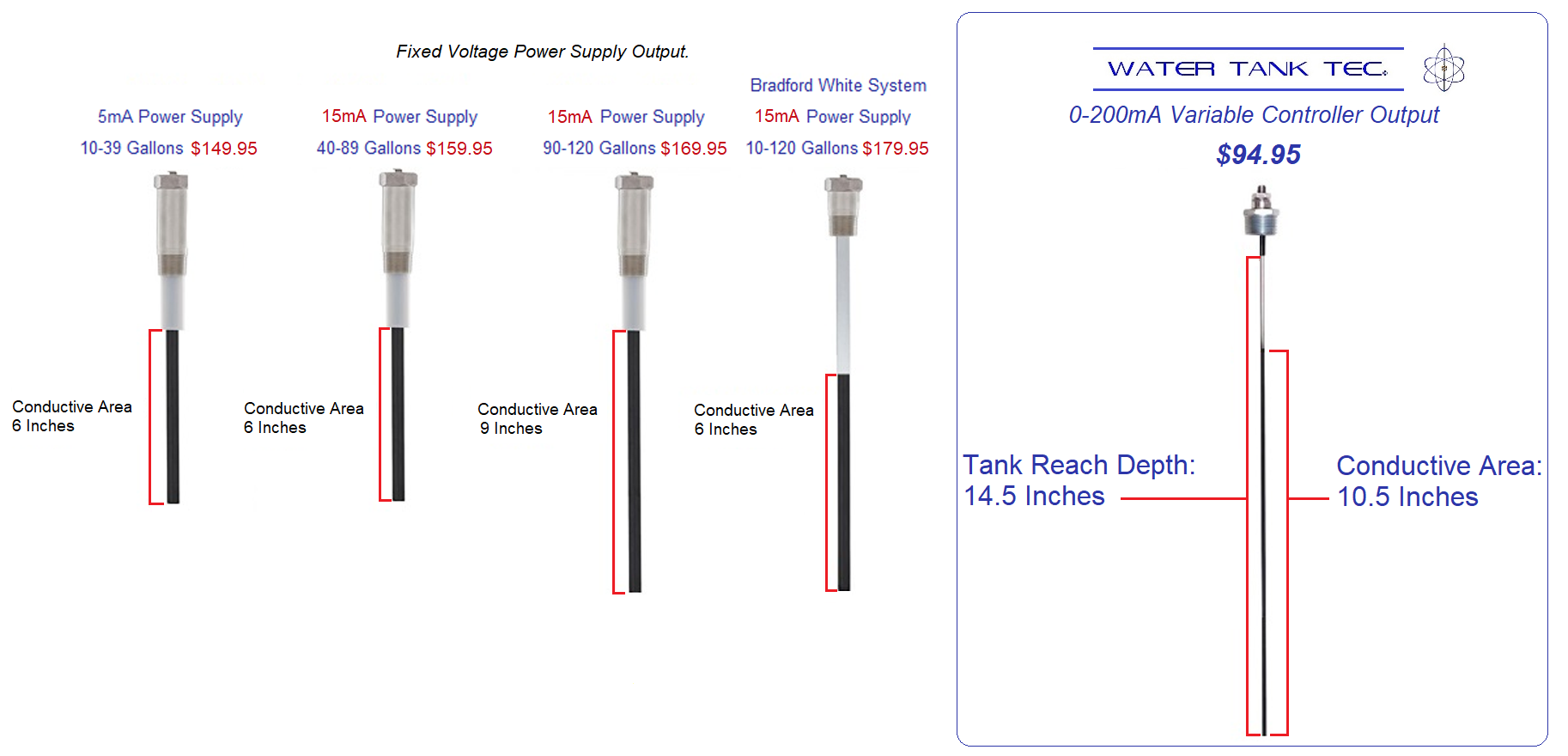 Water Tank Tec employs a 14.5-inch tank reach Anode (10.5-inch conductive area) to ensure total protective electron saturation for 10 to 110 gallons hot water tanks with no gimmicks.