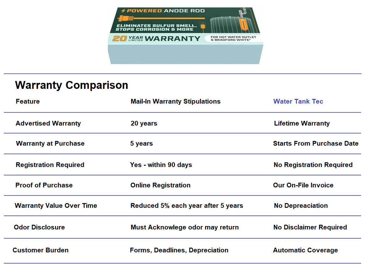 Our properly engineered ICCP system will protect the water tank from internal corrosion therefore there would be no need for a warranty claim other than a failed heating element.